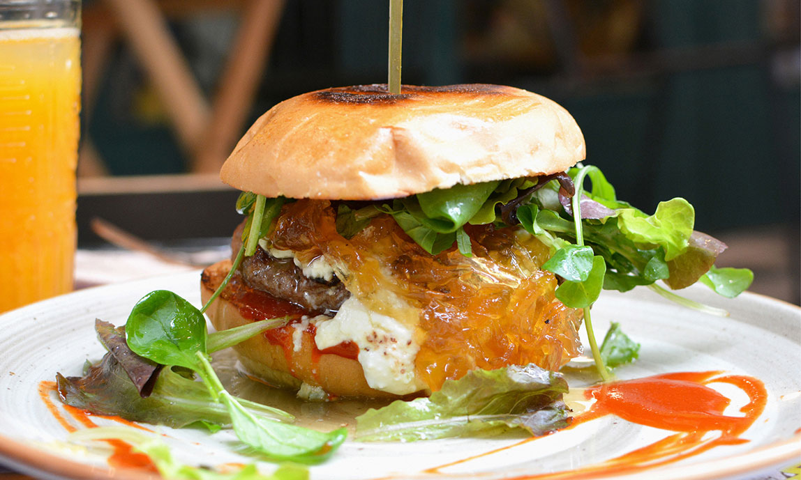 Otoman burger with caramelized onions and shriracha sauce